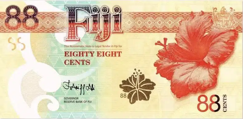 Senitoa, as they call Hibiscus on Fiji islands, has prominent symbolic value for people of those Pacific islands. Here Hibiscus is depicted on a banknote with a lucky number denominational value.