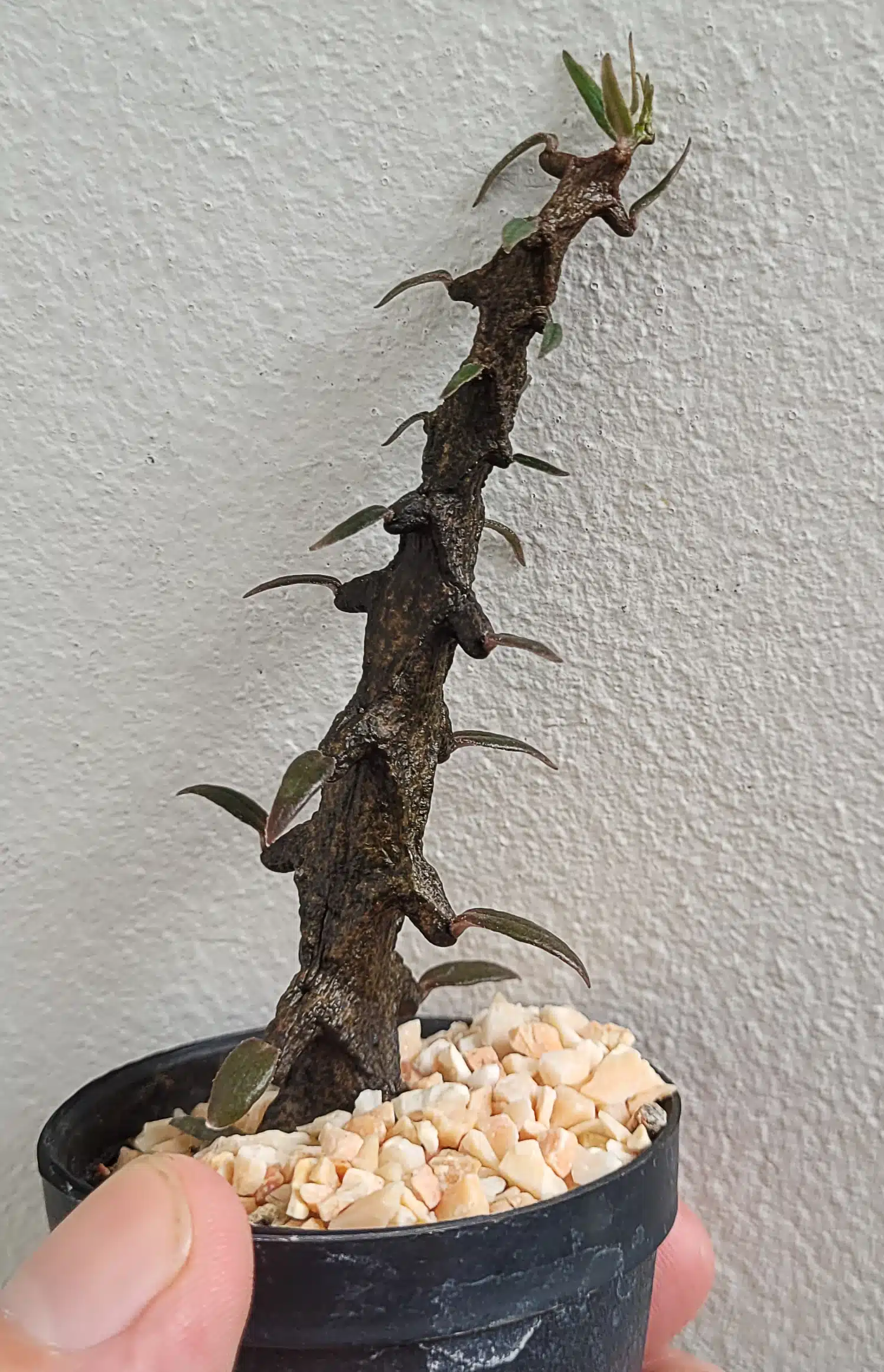 Stems: This plant is recognized for its distinct, twisting stems covered with small, succulent leaves. The leaves are tiny and paired, contributing to the plant’s unusual appearance. The green form has a fresh, lively hue, while the black form appears more dramatic, almost as if covered in blackened thorns.