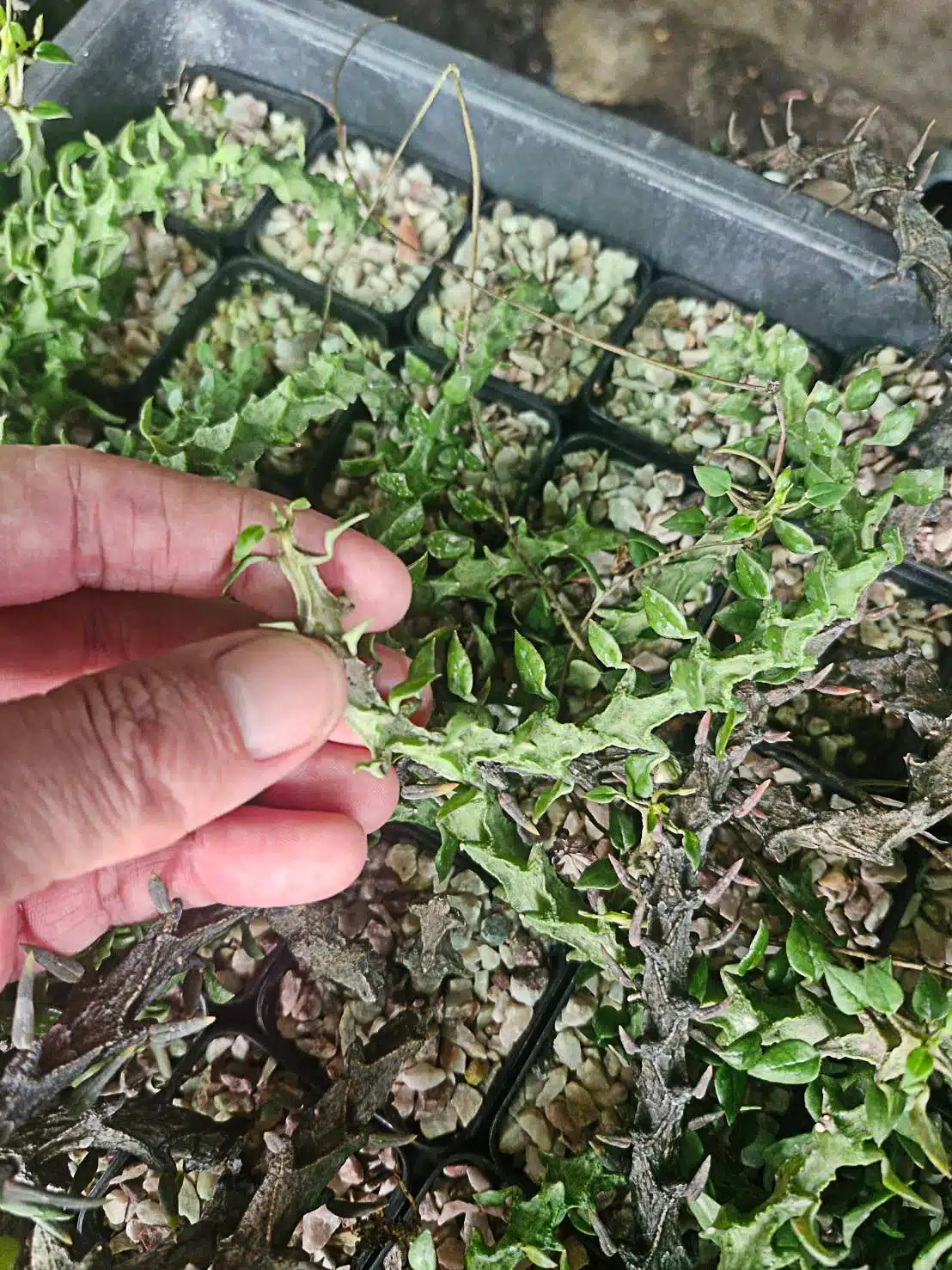 We sell Ceropegia simoneae as rooted cuttings of approximately 10 cm (about 4 inches). These well-established cuttings are ready to thrive in your home or garden, providing an easy start to growing this fascinating plant.