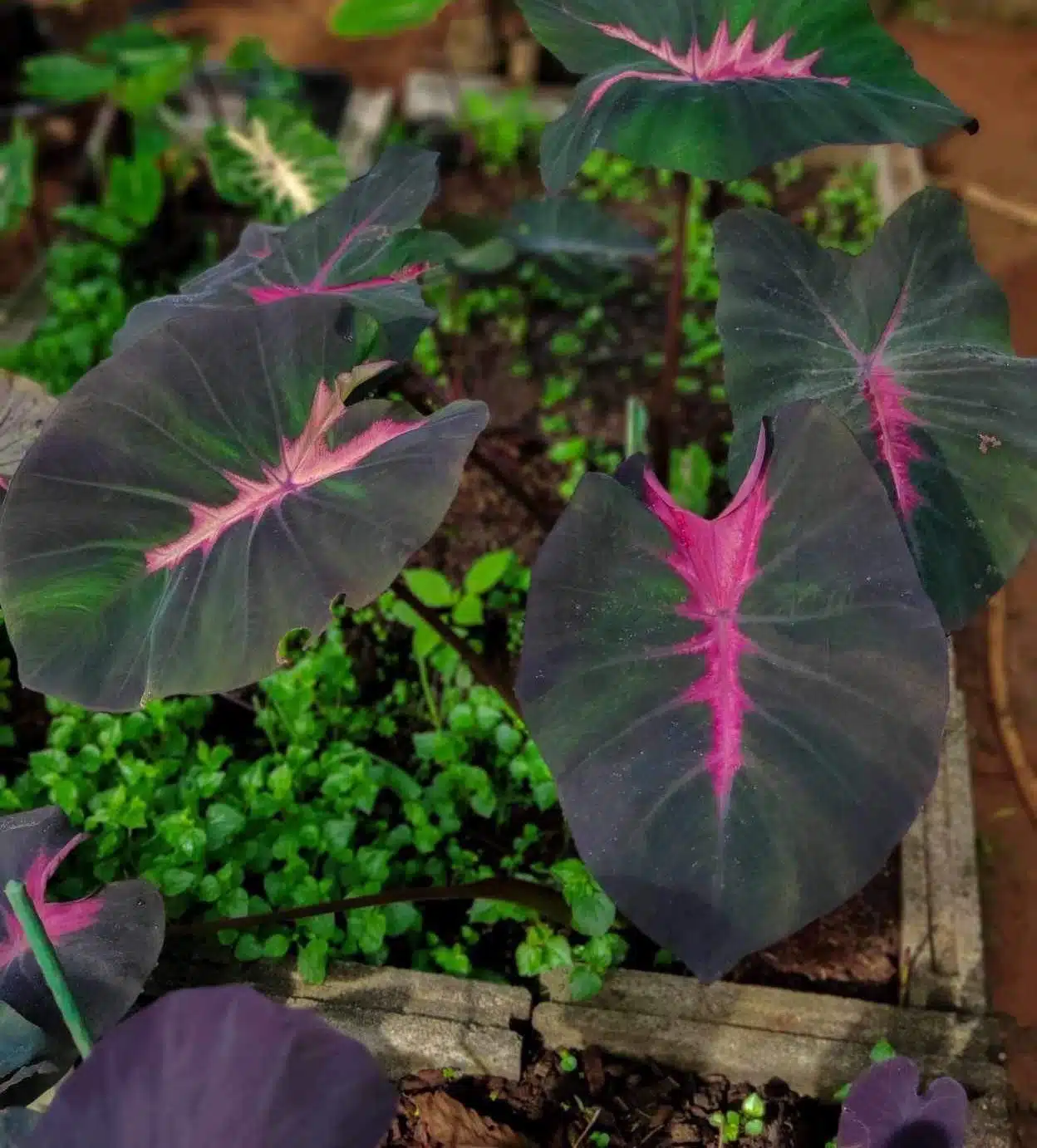 Foliage description: Colocasia esculenta ‘Lovely Pink’ boasts captivating dark purple-black leaves with striking hot pink veins running through the center. These heart-shaped leaves have a velvety texture, and the vivid pink contrasts sharply against the deep, dark background, creating an enchanting and bold visual effect.