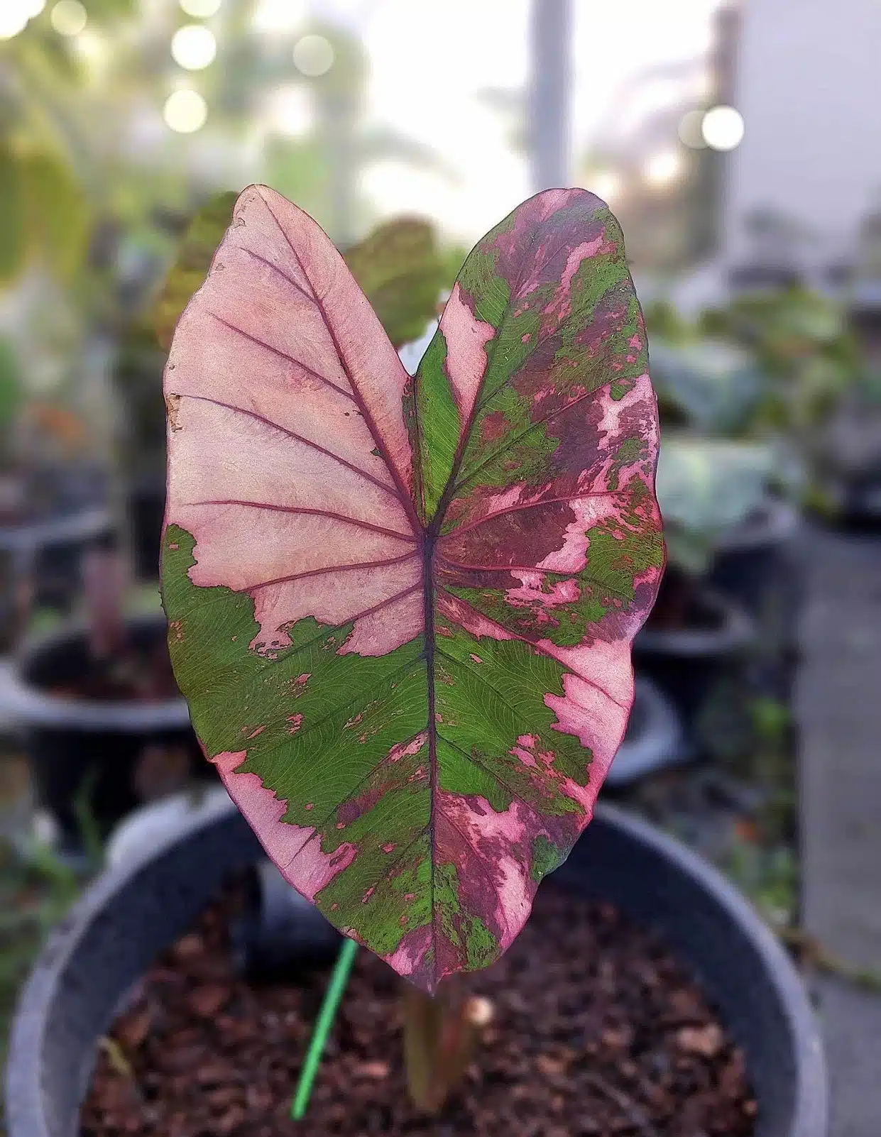 Foliage description: Colocasia esculenta ‘Phusa Diamond’ stands out with its captivating foliage that showcases a unique mix of vibrant pink, deep green, and dark maroon hues. The heart-shaped leaves are marked by a striking mosaic of colors, with pink tones blending into green, creating a beautiful marbled effect. The contrasting maroon veins and patches further enhance the leaf’s intricate pattern, making each leaf appear like a work of art. The foliage has a slightly glossy finish, adding a touch of elegance and a bold splash of color to any garden or container.