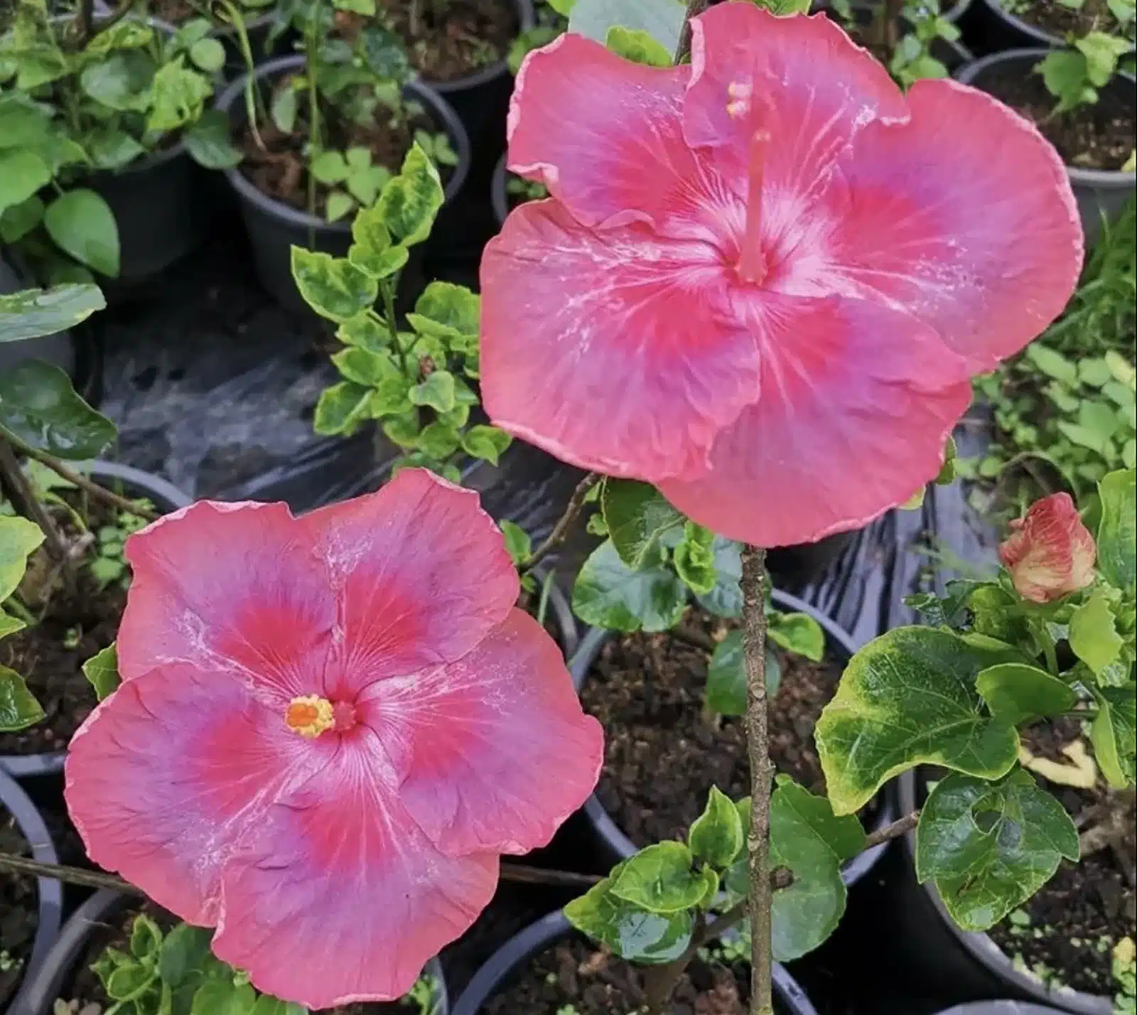 Hibiscus ‘Moorea Sakura’ blossoms with the grace of a springtime cherry tree, its deep pink heart flowing into tender, lighter shades. The smooth petals are kissed with gentle white streaks, evoking the delicate beauty of cherry blossoms in full bloom. This hibiscus flower is a tribute to the serene elegance of spring, bringing a touch of timeless beauty to any garden. Its bright yellow stamens add a burst of sunshine, making Moorea Sakura a captivating spectacle of nature’s artistry.